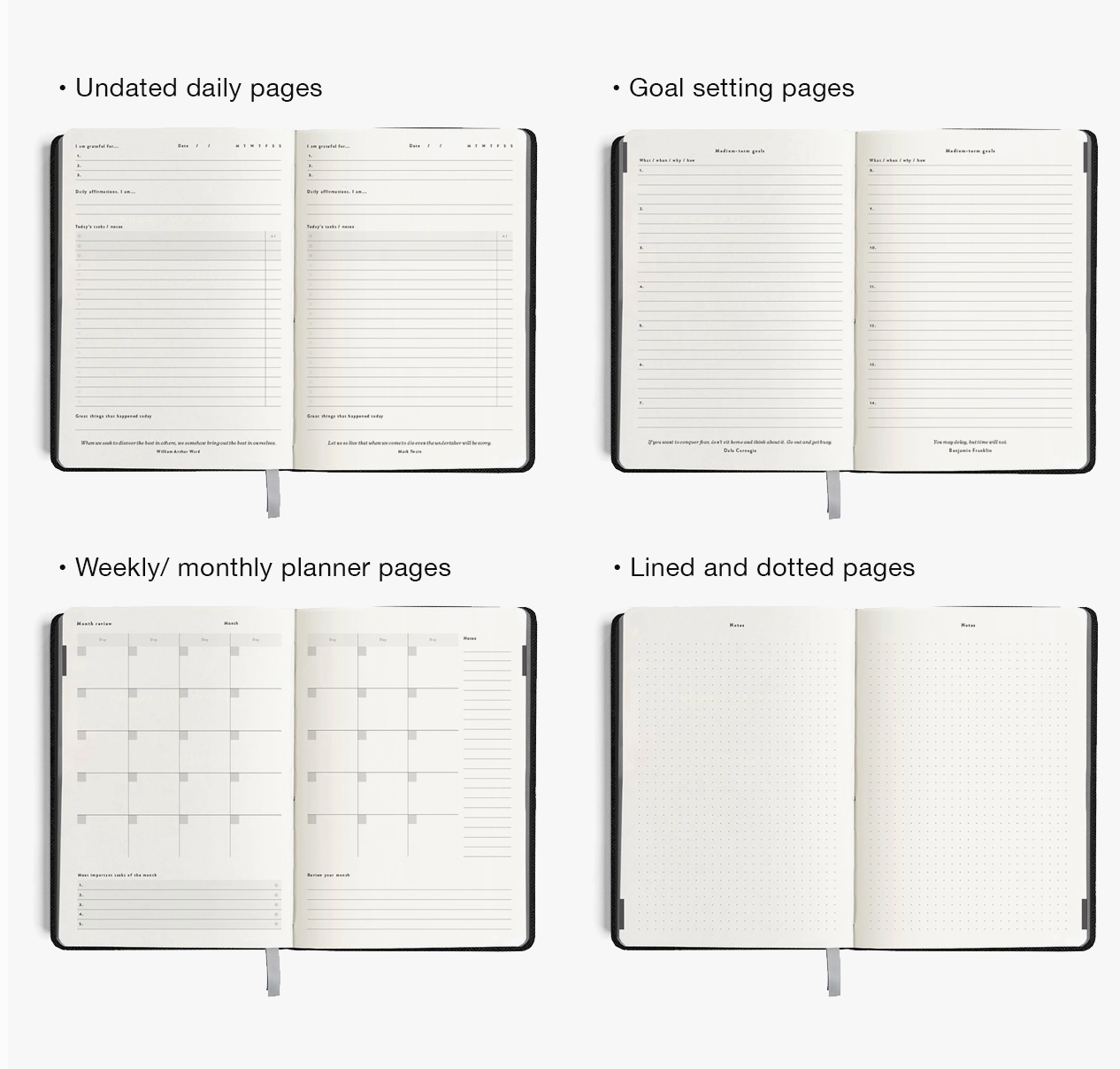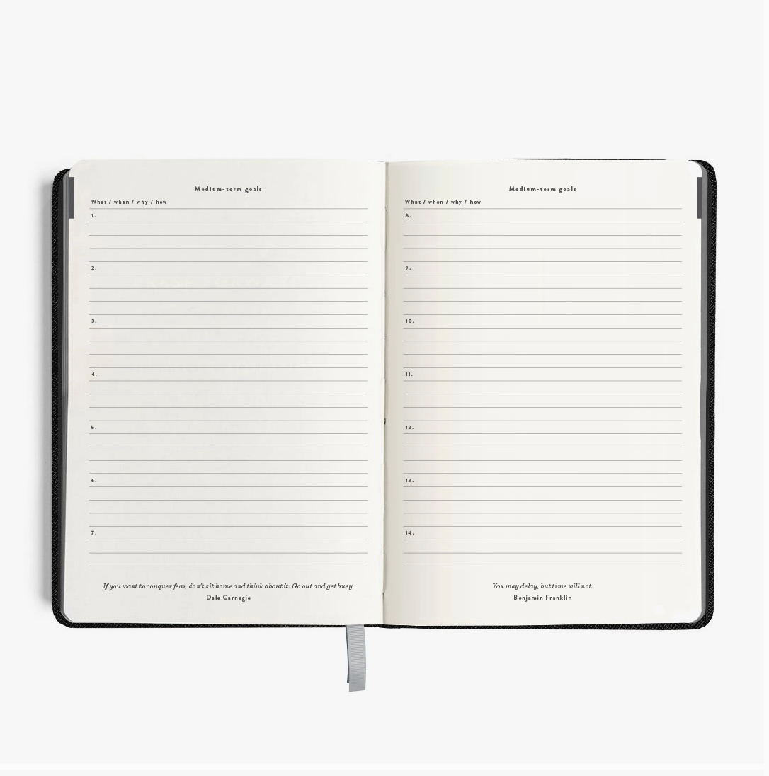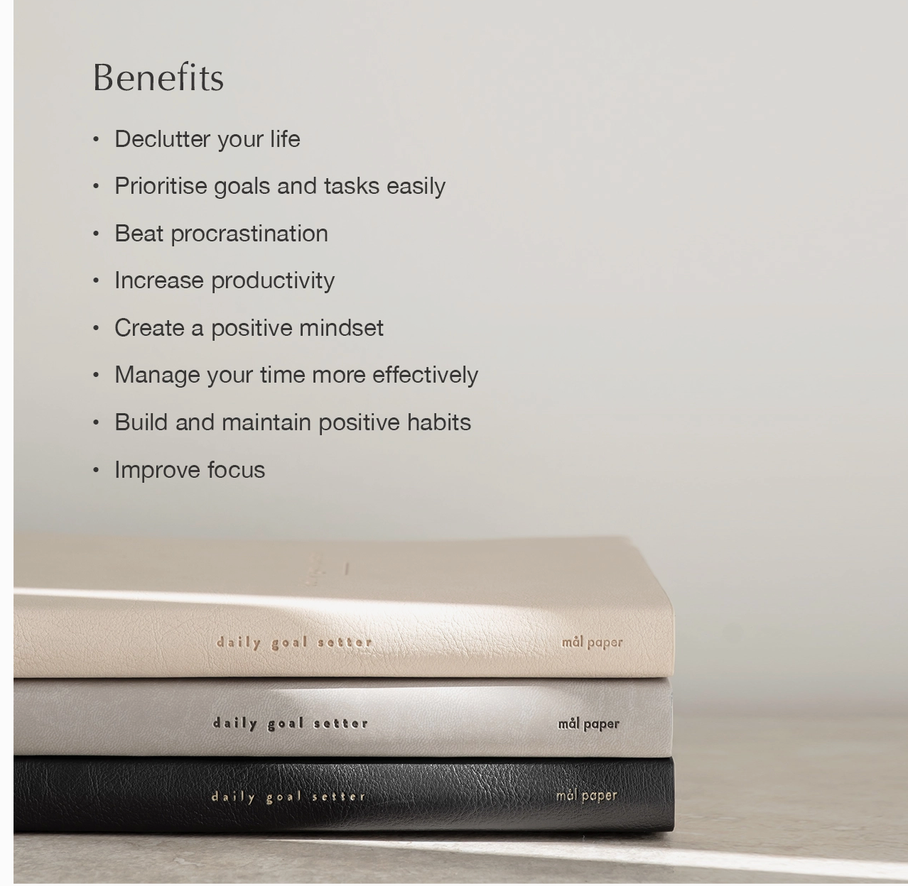 The Daily Goal Setter is the perfect planner to make your goals clearer and help you be more productive. The Daily Goal Setter has been designed to help identify your goals and structure your days.